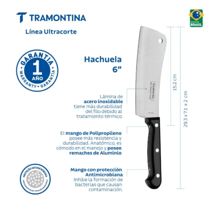 Para precisión y calidad en el corte, la hachuela Tramontina Ultracorte con lámina en acero inoxidable y mango de polipropileno negro de 6 pulgadas es una pieza fundamental en su cocina. Con una lámina en acero inoxidable de 6 pulgadas, posee más durabilidad en el filo debido al tratamiento térmico. El mango de polipropileno negro es resistente y tiene protección antimicrobiana, que inhibe el crecimiento de bacterias y hongos. Perfecta para sus mejores recetas, es una pieza fácil de limpiar y confortable para utilizar, además de apta para el lavavajillas.