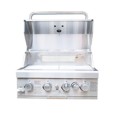 Asador a gas empotrable tipo built-in con 4 quemadores principales + quemador lateral, parrillas robustas y bandeja recolectora de grasa. Ideal para cocinas exteriores y proyectos premium 🔥