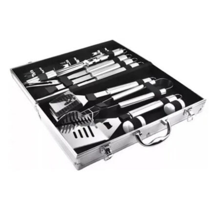 Incluye: Pinzas, Brocha para salsas , Cuchillo de chef para carne, Tenedor trinchador, Espatula, Cepillo limpiador de parrilla, 4 tenedores, 4 cuchillos, Set de pinchos, 6 Pinchos para mazorca