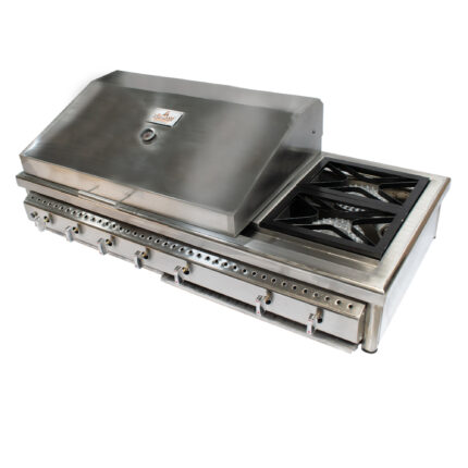 Plancha asadora a gas en acero inoxidable con amplia superficie y quemadores independientes 🔥. Incluye repisa inferior y ruedas para mayor practicidad y movilidad. 🍔