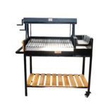 Asador a carbón con parrilla de acero inoxidable de 90 x 60 cms, puede ser tipo varilla, churrasquera en V o mixta. Cuenta con brasero de 30 cms en varilla de acero. La base tiene madera de pino canadiense. Incluye atizador de carbón. La estructura es en lámina de hierro calibre 18 y parrilla en acero inoxidable.