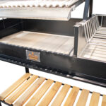 Asador a carbón tipo argentino con estructura y diferentes métodos de cocción.