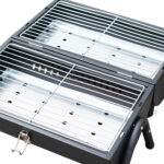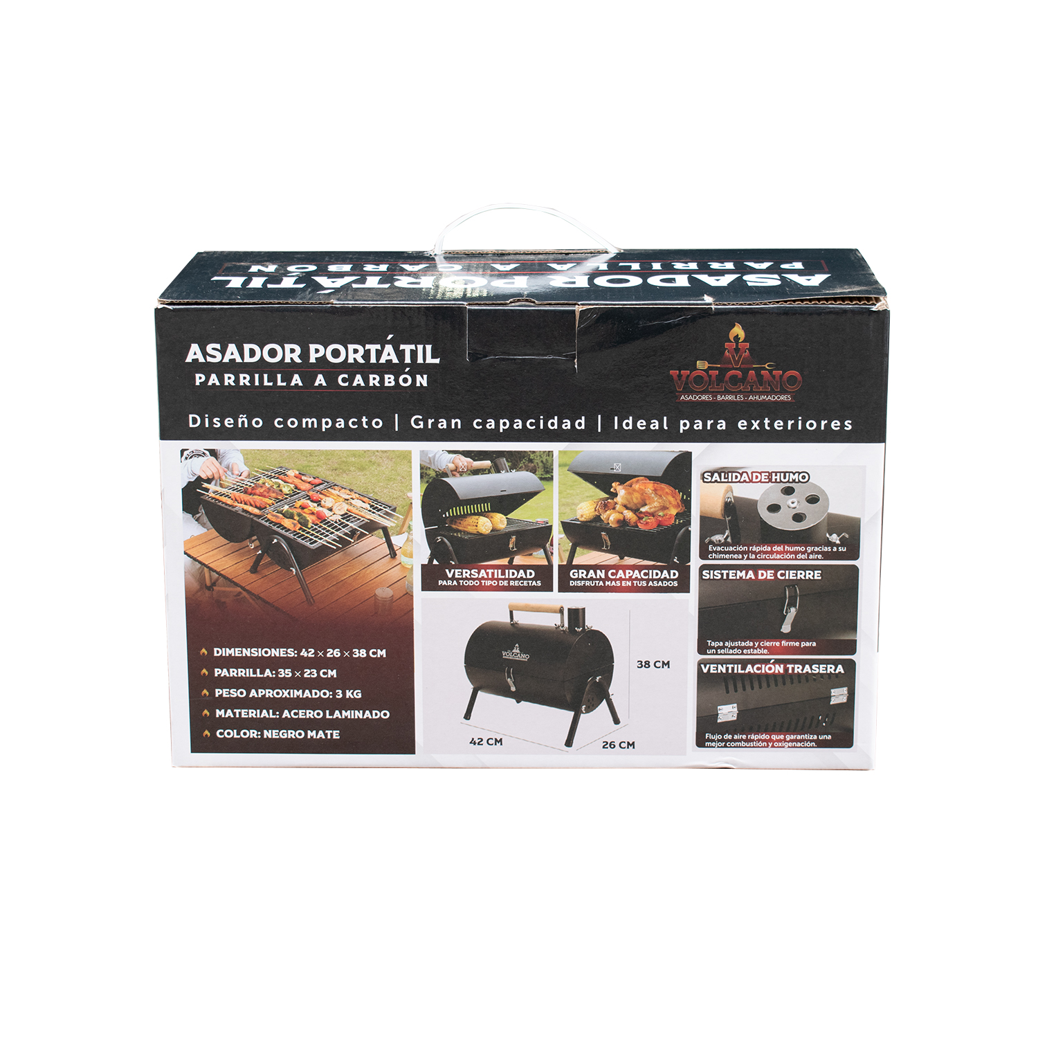 Asador portátil, compacto y resistente, ideal para asados al aire libre, su diseño permite una distribución uniforme del calor, mientras que su chimenea integrada mejora el control del humo. Fácil de transportar