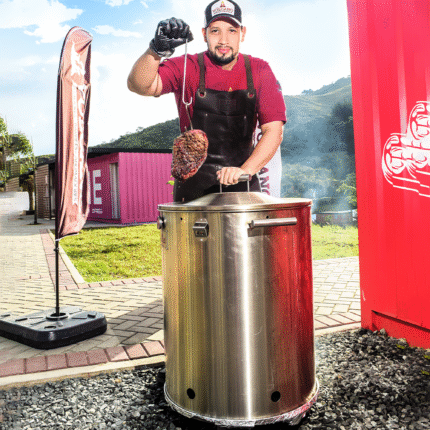 Asador tipo barril 100% acero inoxidable 304. Diámetro: 30 cm – 67 cm de altura – Aprox. 15 libras de carne. Incluye: Parrilla superior, 12 ganchos, 2 garfios de herramienta, fumarola en acero, termómetro interno, destapador, instructivo de uso.
