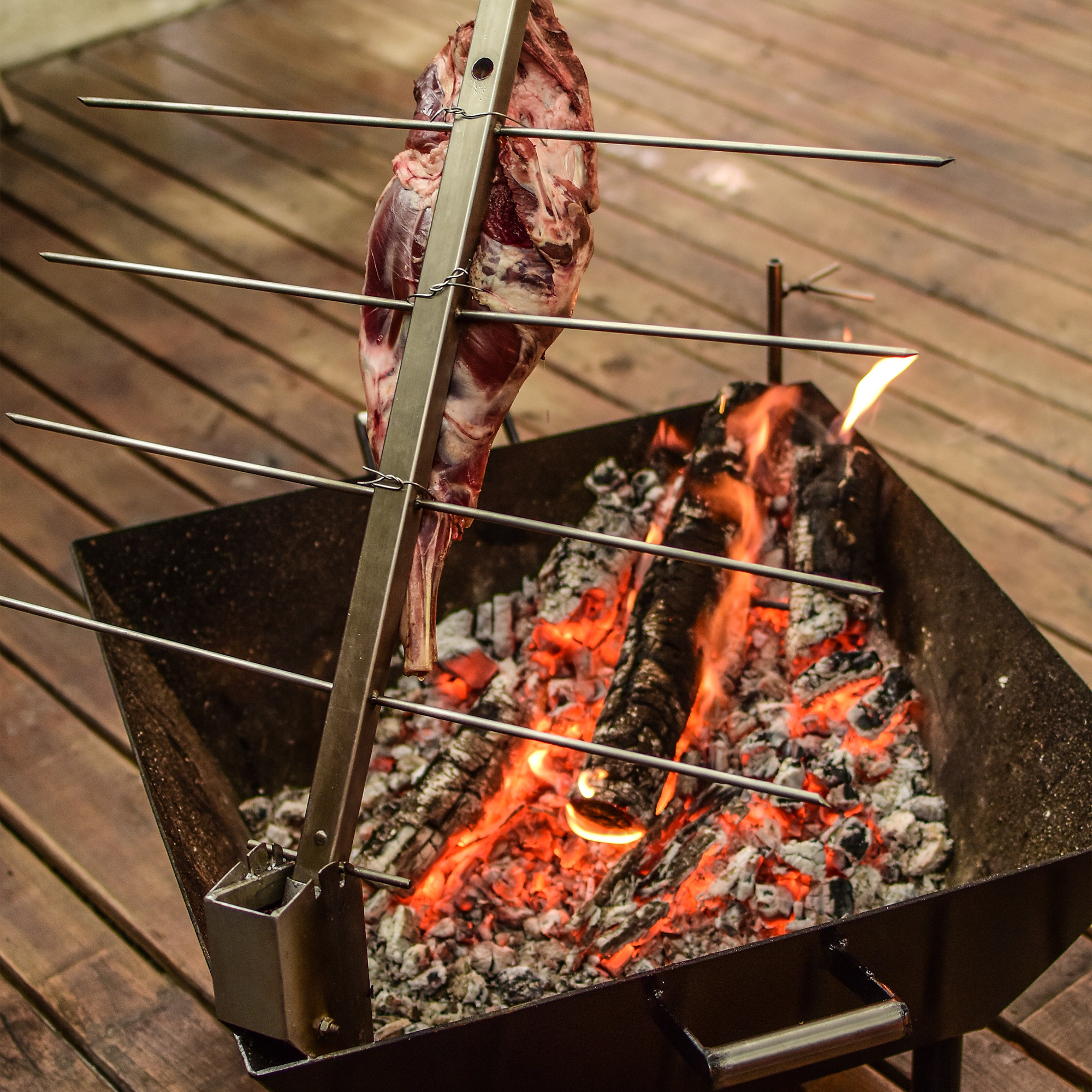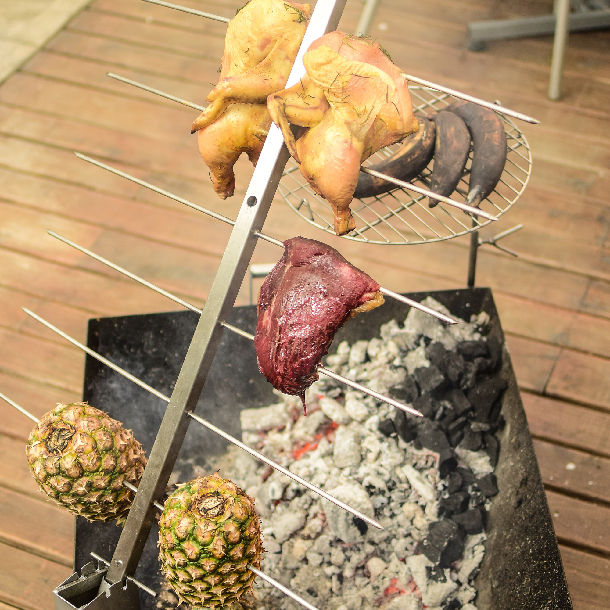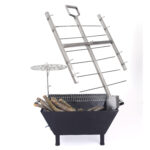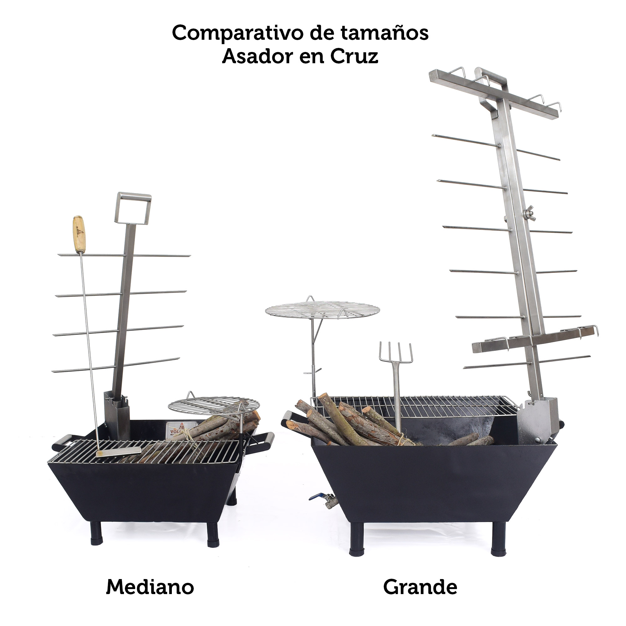 Este asador es especial para cocciones directas e indirectas. Incluye una parrilla en cruz ajustable en 3 posiciones de inclinación + parrilla directa rectangular con 12 ganchos, 2 garfios y un rastrillo en para leñas o brasas + acople de giro 360° + parrilla superior giratoria.