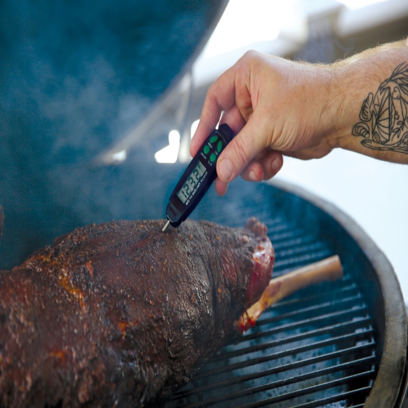 Oficialmente se llama Termómetro Digital de Lectura Rápida para Alimentos Big Green Egg. Y eso lo dice todo. En segundos, lee digitalmente la temperatura de su pierna de cordero o pollo relleno. Con una precisión de hasta 300 °C. Práctico tamaño de bolsillo, y el asa sirve como estuche.