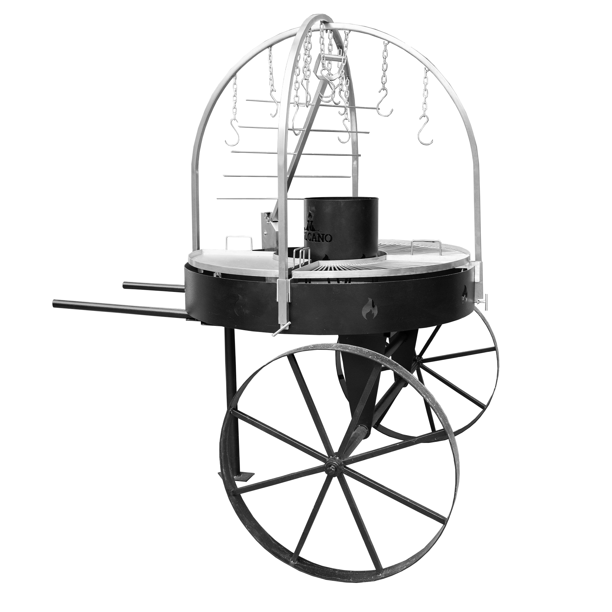 Domo tipo carreta multifuncional con diseño robusto y ruedas, ideal para asados al carbón con estilo, versatilidad y movilidad.