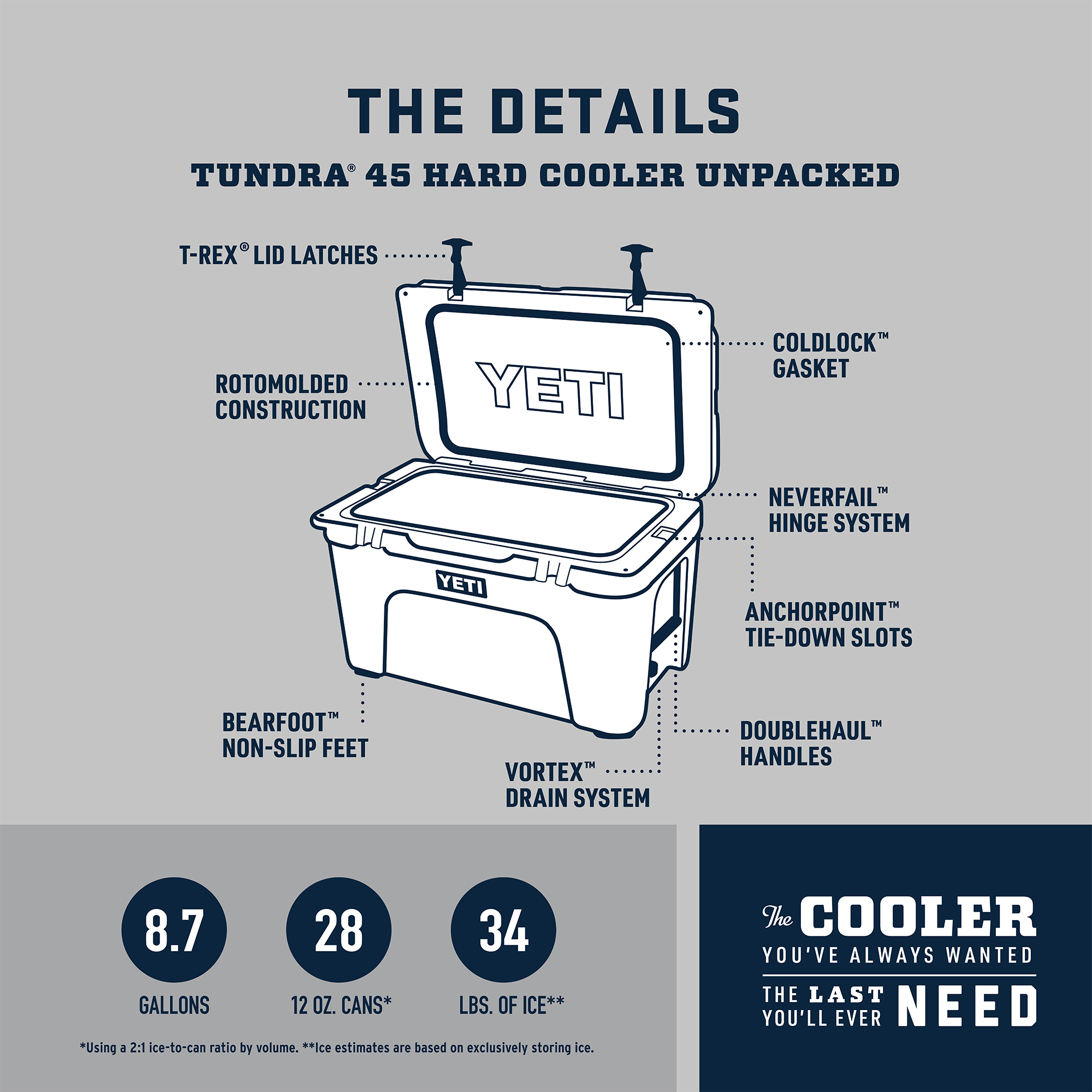 La Tundra 45 de YETI está hecha para aventuras sin límites. Con capacidad perfecta para tus días de pesca, parrilla o camping, esta nevera mantiene tus provisiones heladas sin importar el calor. Es resistente, confiable y está lista para acompañarte donde sea que vayas.