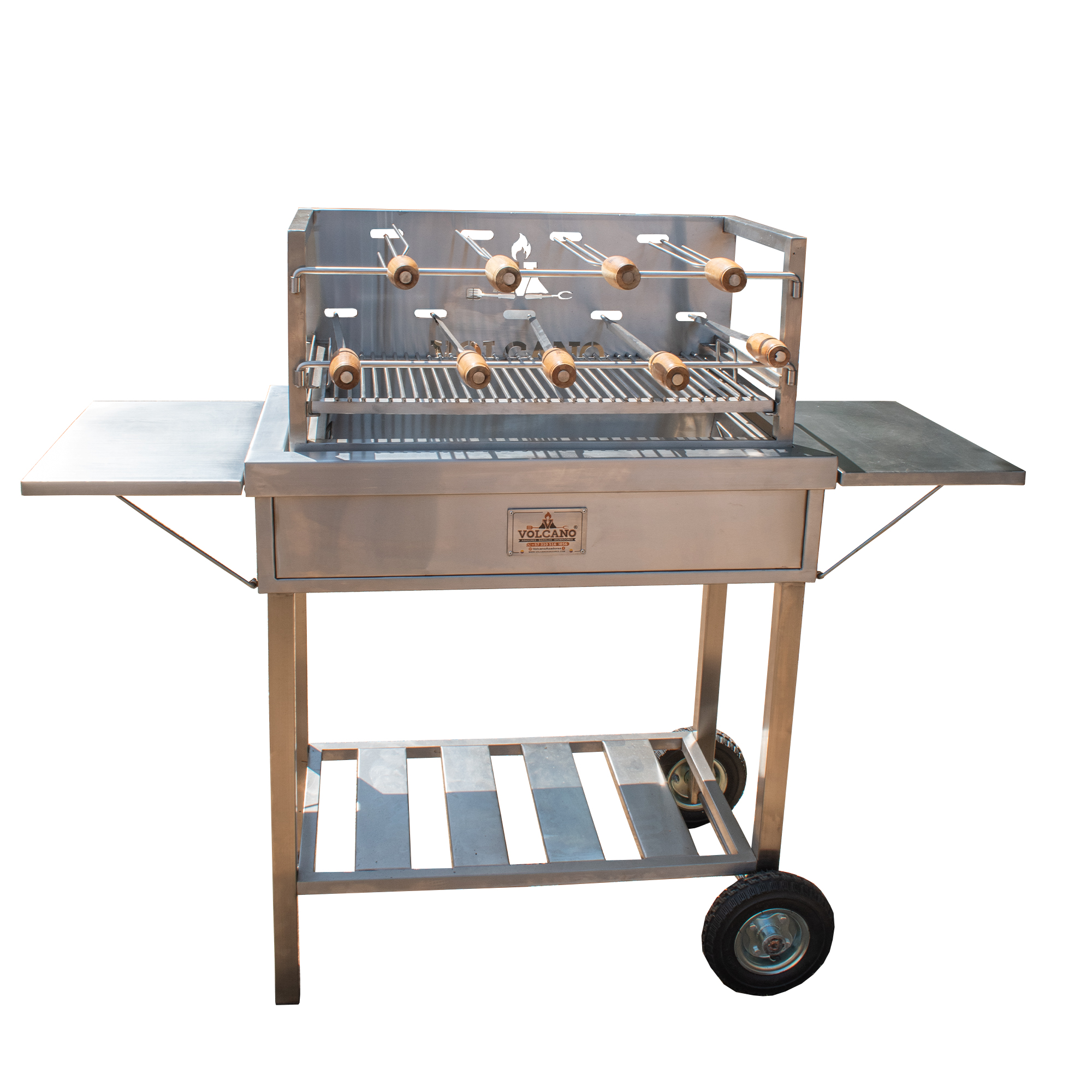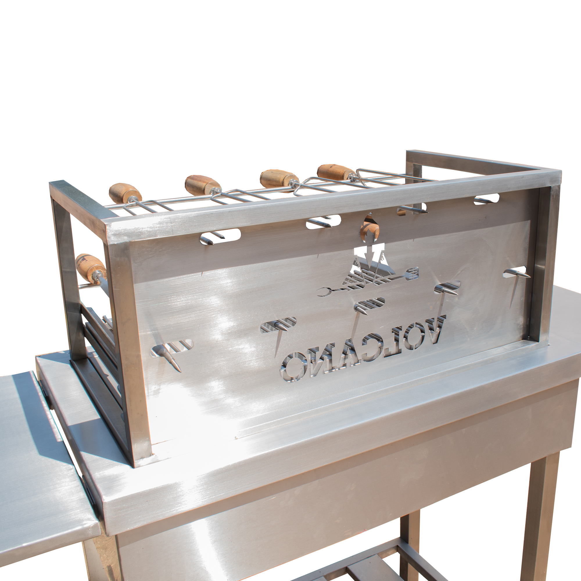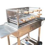 Asador en acero inoxidable con sistema de espadas giratorias y parrilla ajustable, ideal para preparar carnes de forma uniforme y profesional. Diseño robusto, higiénico y fácil de usar, perfecto para reuniones y negocios.